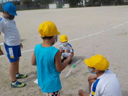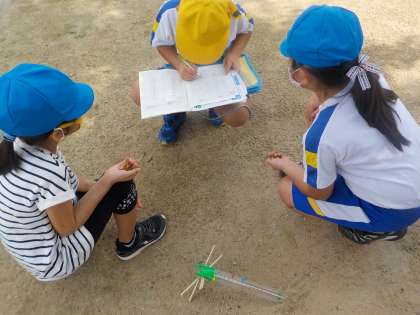 棒温度計を使って、日なたと日かげの地面の温度を調べました。午後の日なたの温度が40度を超えるグループもありました。次回は、結果からまとめを行います。