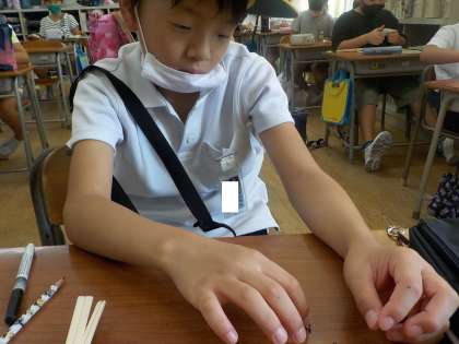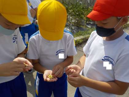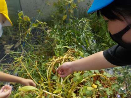 子どもたちはできた実の中が気になり、実を切って観察しました。種がたくさん入っていることや初めに植えた種と同じ物だったことにとても驚いていました。