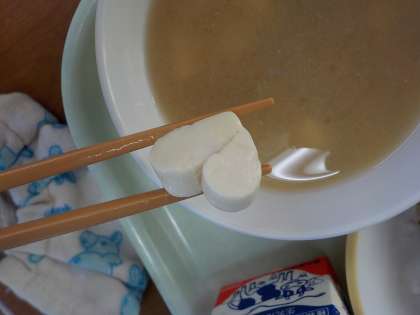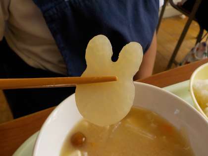 今日は野菜の日でした。給食では、なめこ汁に野菜がたくさん入っていました。何と、その中の大根や人参、豆腐にも型抜きされたものが入っていました。子供たちは、アヒル、ハート、うさぎ、星等の野菜を見つけては、うれしそうに食べていました。