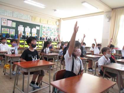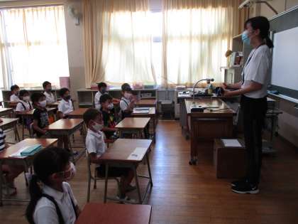 今日から教育実習の先生が来られました。先生の紹介の後、子供たちは「どんなスポーツが好きですか」「どんな食べ物が好きですか」とたくさんの質問をしていました。