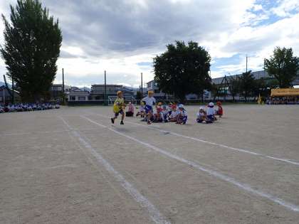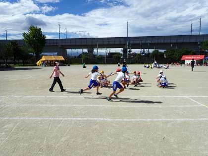 キセキのハピスマオリンピック。学年別リレーでは、これまでの練習の成果を発揮しようと、みんな一生懸命に走りました。バトンパスもずいぶん上手になりました。結果は、1位黄団、2位白団でした。