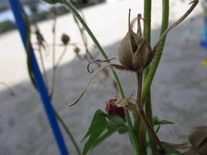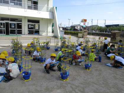 久しぶりにあさがおの観察をしました。もう実が茶色くなって、中にはたくさんのたねができています。「たまねぎみたいな形だね」「中は4つのお部屋に分かれているよ」「数えきれないくらいいっぱいたねができているよ」など、子供たちはいろいろなことを発見していました。