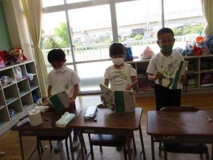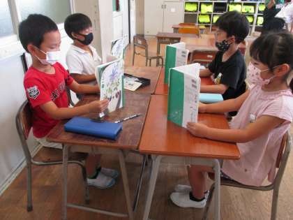 国語の学習「やくそく」の音読をがんばっています。グループごとに分かれて役割を決め、練習しています。すらすら読むことができるようになり、身振り手振り等の動きをつけるグループも出てきました。