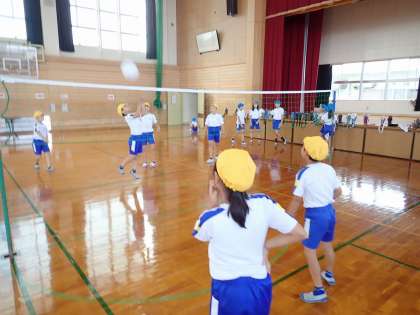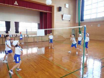 ネットを張って、対面でどれだけラリーが続くか試してみました。自分の思ったところに上げられず、苦労している子もいましたが、一生懸命プレーしていました。