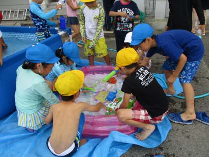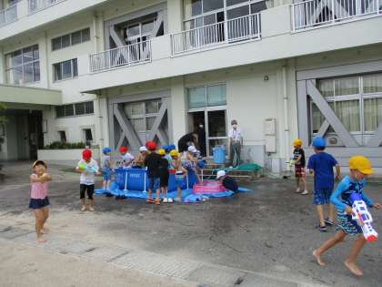 今日は、休み時間に水遊びをしました。大きなプールに勢いよく「バッシャーン!」と入ったり、友達と水を掛け合ったりして楽しみました。短い時間でしたが、大喜びの1年生でした。