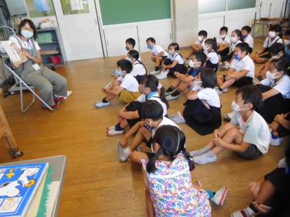 今日の朝の時間は、地域の方に来ていただいて読み聞かせをしていただきました。「ペッエッティーノ」「リットルのえほん」のお話を聞きました。国語の教科書にも載っている本を読んでくださいました。みんな、静かにお話の世界を楽しんでいました。