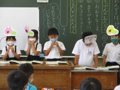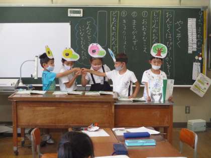 今日は、「やくそく」の音読発表会をしました。身振り手振りをつけたり、友達と声をそろえて音読したりしました。お互いの音読を見合い、友達の音読の素敵だと思ったところをたくさん発表しました。発表が終わった後は、「緊張した〜」「○○さんの動きが上手で、まねしたくなった!」とうれしそうな子供たちでした。