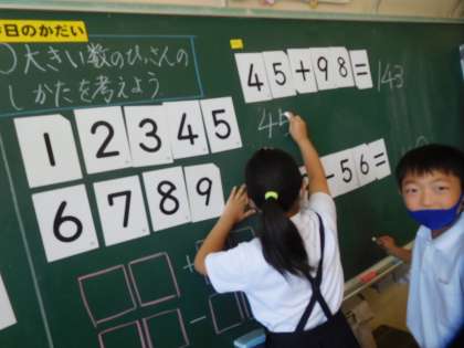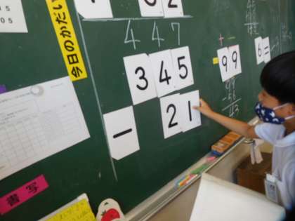 今日の算数の時間では、大きい数のひっさんのしかたを勉強しました。2桁同士のたしざんひきざんの計算から、一つ大きくなった3桁と2桁のひっさんのしかたを考えました。