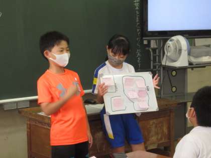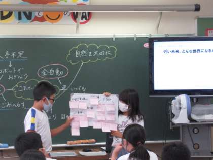 まとめたものをみんなの前で発表しました。初めて取り組んだ活動だったのですが、どの子も上手に伝えていました。「Society5.0」の世界の動画をみて、「未来が楽しみだな」「他の問題も出てきそう」と様々な反応をしていました。