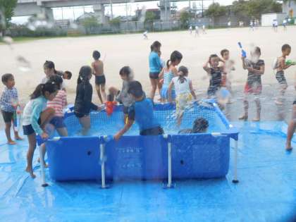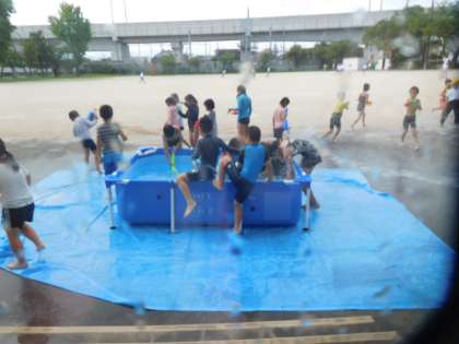 今日の体育の時間では、水遊びをしました。午前中は天気もよく、気持ちよく水で遊ぶことができました。楽しい時間はあっという間で、子供たちは、まだまだ時間が足りなかったみたいでした。