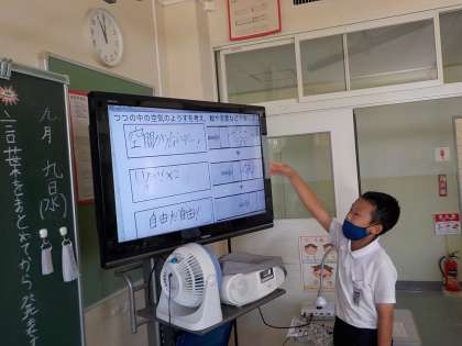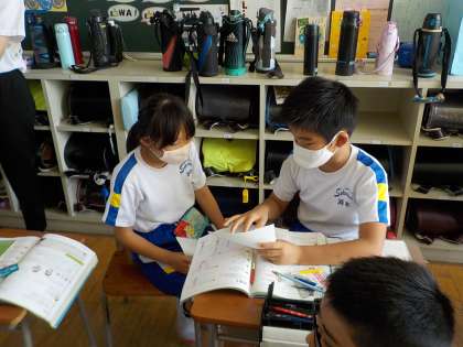 今日の理科では、前の時間にやった実験結果から、玉が飛び出す時の空気の様子について、自分の考えをまとめました。それを隣同士で交流し合いました。目に見えない空気の姿を想像し、自分の考えを相手に分かるように伝えようと、モデル図を描いたり、身振り手振りで説明したりと、楽しそうに学習に取り組んでいました。子供たちの成長を感じました。