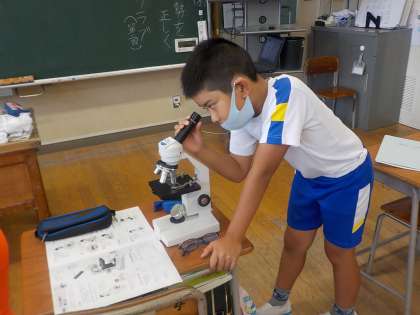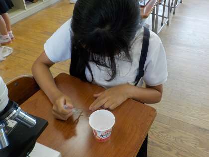 今日のクラブ活動、ネイチャークラブでは、プールの水、池の水、メダカの水槽の水にはどんな生き物がいるのかを観察しました。一人1台の顕微鏡を使っての観察は理科の授業ではなかなかできない体験でした。5、6年生は顕微鏡は使ったことがあるので、4年生に教えてあげるなど他学年との交流も見られました。プレパラートを作成するのも楽しかったようです。