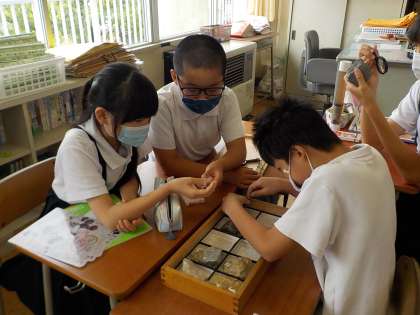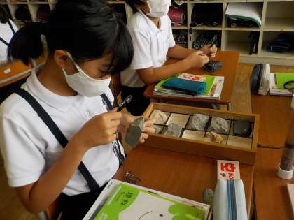 今日は、いろいろな岩石標本を観察しました。堆積岩と火成岩に加えて、化石の標本や火山噴出物の標本もありました。グループでの活動でしたが、虫めがねを使って詳しく見たり、手触りや重さを確かめたりと、楽しく学習することが出来ました。