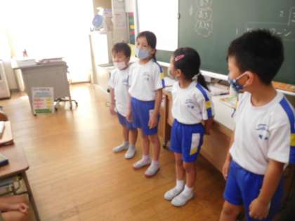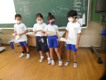 今日の音楽の時間では、生活の中にある音を使いながら、音楽で表現し工夫して発表しました。風の音や生き物の鳴き声を事前に調べてきて、グループごとに、音の長さや大きさ高さに気をつけながら、つなげ合わせて発表しました。みんな、日常生活にある音を工夫して、音楽にしているグループや長さを変えておもしろい音を表しているグループがあり、とてもおもしろかったです。