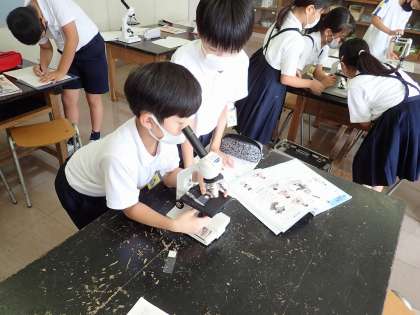 顕微鏡の扱いに慣れるため、様々なプランクトンや動植物の一部のプレパラートを観察しました。形がはっきりと見えるたびに子供たちから声が上がり、楽しみながら機器を使用することができました。