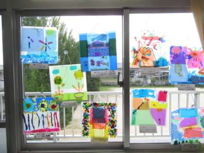 図工でつくっていた、「光のさしこむ絵」を窓に飾りました。みんなの作品がきらきら光って、きれいでした。