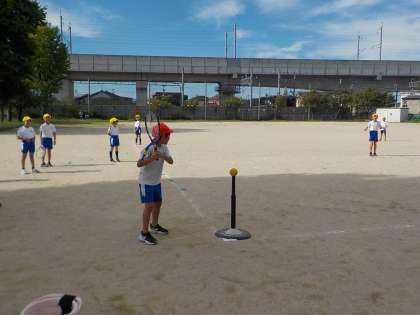 今日は、グラウンドでラケットベースボールの学習をしました。