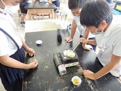 今日は、べっこう飴を作りました。カップの中の砂糖が焦げないように、優しく混ぜたり火の当たる位置を変えたりするなど、火に気を付けながら活動しました。