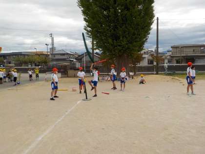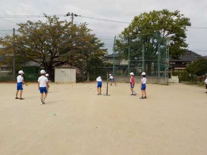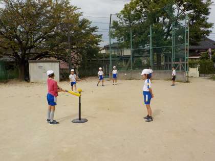 3年生は、体育の時間、ラケットベースボールからティーボールへとステップアップしました。色団ごとにバットでボールを打つ練習をしました。女の子たちも、意欲的に取り組んでいました。