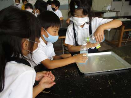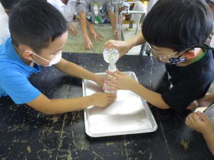 2つの容器に入った水の量を比べる学習をしました。どちらがたくさん水が入るか予想して、比べ方を話し合いました。班のメンバーで協力しながら、片方に入った水をもう片方に移すと水があふれ、「こっちのほうが多いね!」と気付いていた子供たちでした。