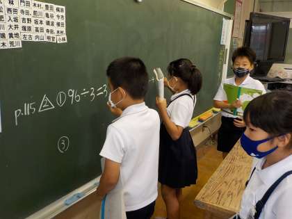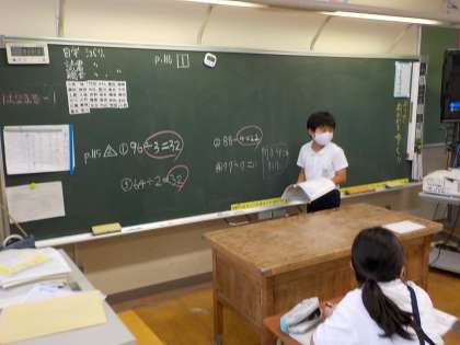 3年生は、宿題の答え合わせの際、学習係が司会者となって自分たちで丸付けを進めました。回答者が前で全体に向かって説明します。自分たちで学習を進めることも一つの方法です。