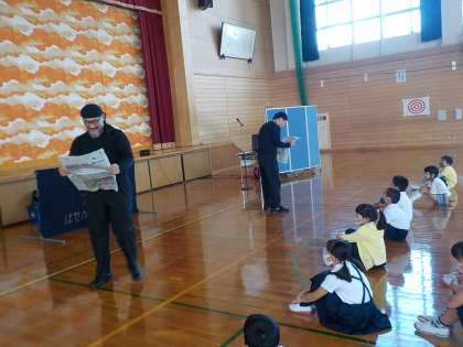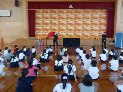 「マイムの時間」と題して、学校巡回劇場でパントマイムやジャグリングを鑑賞しました。傘や新聞紙を使っての台風や洗濯機などの身体表現を見せていただきました。