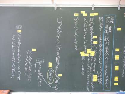 「クラスみんなで決めるには」を学習し、今日は実際にクラスで話し合いをしました。議題は「秋の集会にむけて目当て考える」です。友達の意見を聞きながら、入れたい言葉や大事にしたいキーワードを考えました。なかなか決まらず話し合いも予想外の方向に行ったようですが、とても大事な時間になったと思います。