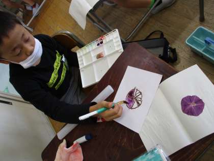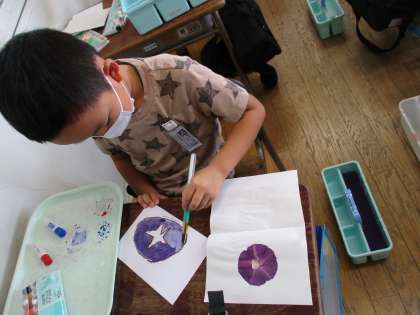 昨日、あさがおの押し花を作りました。摘み取ったあさがおをそうっと紙の間に挟み、重しを乗せて一晩待ちました。今日は、その押し花を取り出してみました。「ぐちゃぐちゃに汁が出ているんじゃない?」「ちゃんと色出ているかな」と心配そうにしていた子供たちでしたが、きれいにできていました。そのあさがおの色を、水彩絵の具で再現してみました。子供たちは、いろんな色を混ぜながらそっくりの色合いを作ろうとチャレンジしていました。
