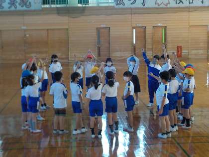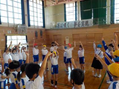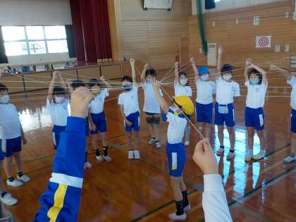 算数では「まるい形」について学習しました。円の定義は「一つの点から等しい距離にある点の集まり」とあります。子供たちは直感的には分かっているようで、なかなか理解するのは難しい概念です。今日は、一人一人が2mのひもを持ち、中心にいる子と両端を持って、ひもをピンと張ってみました。「円」を体感してみました。来週はいよいよ「コンパス」を使います。
