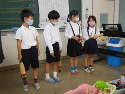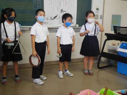 今日の音楽では、虫の声の鳴き声のところをいろいろな楽器を使って、各班で演奏しました。どの班もリズムを変えたり、大きさを変えるなど工夫して美しい虫の声を表現していました。