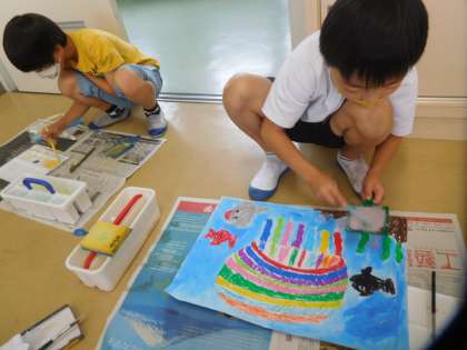 今日の図画工作科では、スイミーの「お話の絵」を仕上げました。絵の具と金あみと歯ブラシを使って、作品にスプレー模様を付けました。1色ではなく何色も使っている人や、友だちと協力する場面も見られました。どの作品も、海の中の様子がとても素敵にできました。