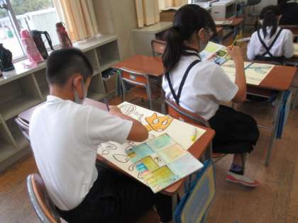 国語で学習した「ごんぎつね」の心に残った場面を絵にしています。今日から水彩で色を塗り始めました。同じ場面でも、それぞれの見方や構図が違い、どれもおもしろい作品になりそうです。
