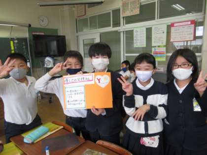 総合で活動している会社の看板が完成しました!社員一人一人が意見を出し合い、会社の願いや、ロゴマークを考えました。商品開発に向けて、さらに一歩前進です。