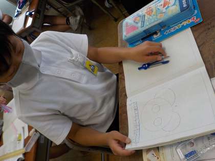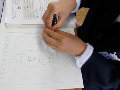 授業の後半は、自由にコンパスを使って円を描きました。子供たちの成長は早いです。ほとんどの子供が、コンパスで円を描けるようになってきました。中心は変えずに、半径を変えながら円を描いていたTさん、くまさんが描けたよと自慢していたSさん、オラフが描けたと、喜んでいたMさんなど、コンパスで描き出される曲線の面白さに、子供たちは楽しみながら取り組んでいました。