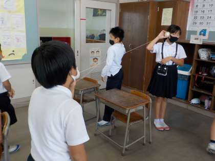 今日の理科の時間は、アイスクリームのプラコップや大きいプラスチックのコップを使って、糸電話を作り、音の伝わり方を比べてみました。