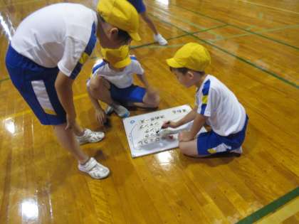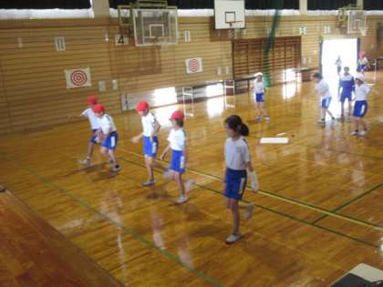体育で、リズムダンスをしています。アンプラグドのプログラミングの学習を生かして、ステップと動きを組み合わせながら、振り付けを考えます。今日は音楽に合わせて踊ってみました。少しずつチームのみんなと息が合ってきたようです。