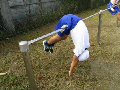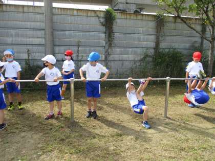 今日は、2回目の鉄棒をしました。カードにある項目をみんなで一つ一つ試していきました。「ここをこうやってするんだよ」「すごい!○○くん、できてる!」と、子供たち同士で教え合ったり励まし合ったりしていました。