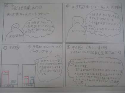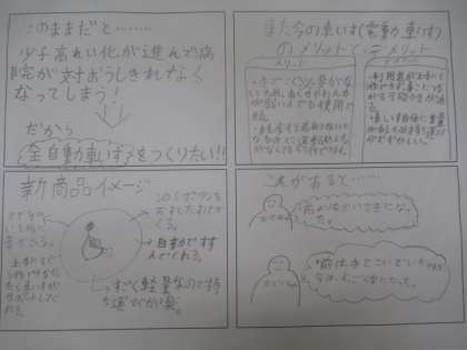 取材活動や、調べ活動を終え、それぞれの会社で作りたい商品が少しずつ決まってきました。商品をつくるための企画書をつくっています。インタビューや、調べたデータから読み取れる問題点を出し合い、笑顔に変えるために考えた商品のポイントを主張します。