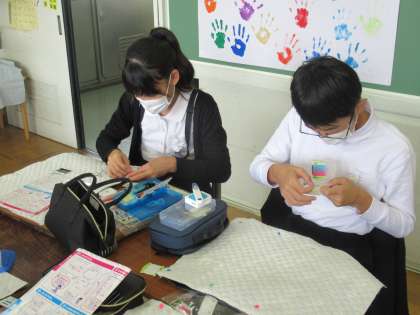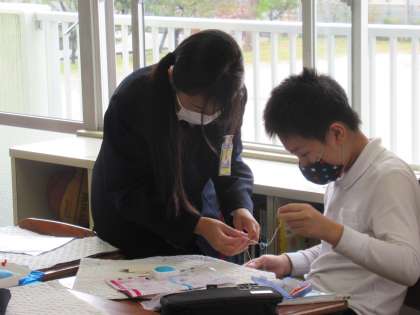 久しぶりに裁縫セットを使う子供たちも多く、玉結びや玉どめに悪戦苦闘する場面もありましたが、みんなで教え合いながら取り組んでいます。