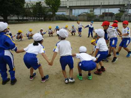 最近の子供たちは、体育で外に行くたびに「おうい、くじらぐも〜!!」と空に向かって叫んでいます。国語で学習している「くじらぐも」に、みんなで手をつないでジャンプする場面があります。その様子をまねして、みんなでチャレンジしてみました。「もっとたかく、もっとたかく!」みんな、一生懸命です。