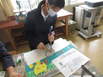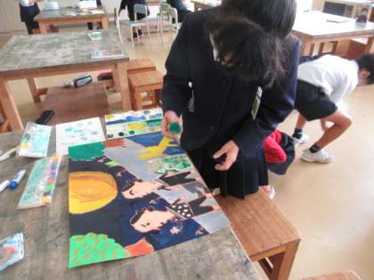 「ごんぎつね」の作品が完成してきました。スパッタリングやスポンジスタンプ等、場面に合わせた表現を工夫しながら作っていっています。同じ場面でも色使いや表情が違って、どの子もおもしろい、すてきな作品になりました。
