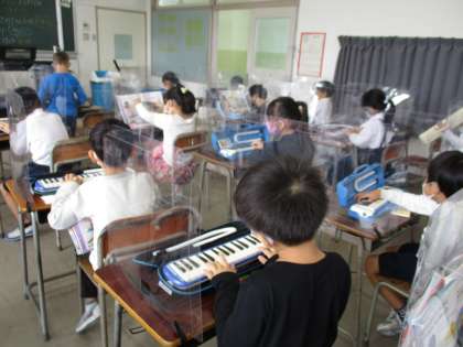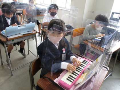 音楽で、鍵盤ハーモニカの学習を始めました。ホースのくわえ方や指の置き方、後始末の仕方を学習しました。今までずっと楽しみにしていた子供たちは、きまりを守って楽しく鍵盤ハーモニカをふきました。