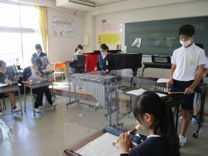 音楽の時間に「ラバーズコンチェルト」の合奏をしました。曲の雰囲気に合う楽器やマレットを選ぶなどの工夫をして、それぞれのグループで合奏に取り組んでいました。お互いの演奏を聴き合った後には、どんなところがよかったかを伝え合いました。