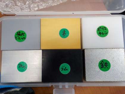 今日は、「同じ大きさ(体積)なら、材質が違っても重さは同じだろうか」という課題で重さを調べてみました。鉄、アルミニウム、ポリエチレン、塩化ビニル、ゴム、木の6種類の材質です。まずは、見た目で予想しました。多くの子供は、違うと思うと予想しました。「鉄や木が重そうだよ」「ゴムは軽そうだ」などの予想が出ました。