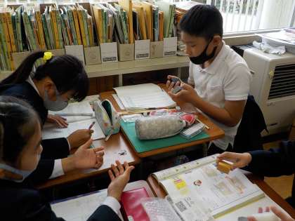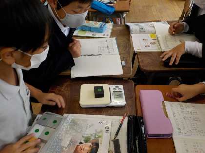 次に、手で持ってみました。「木が軽そう」「鉄は絶対思いよ」という声が上がっていました。最初の予想を修正し、いよいよ測定です。電子てんびんの使い方にも慣れてきた子供たち。測定の結果を受けて、「同じ体積でも材質によって重さが違う」ということを実感できました。