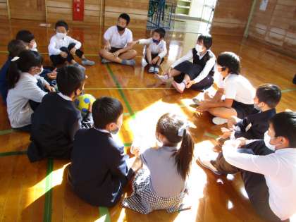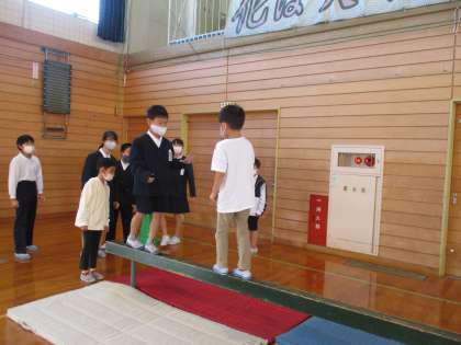 6年2組とは体育館で遊びました。各色団に分かれて、いろいろな遊びを楽しみました。振り返りの時間には、「とっても楽しかったです。また遊びましょうね。」と1年生から6年生に声をかける場面も見られました。