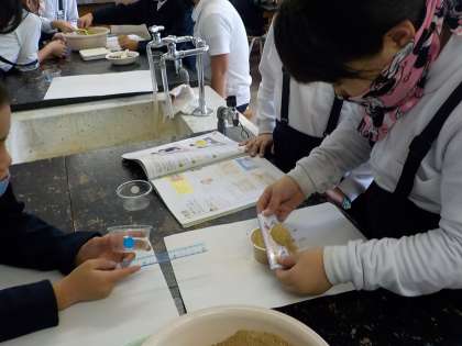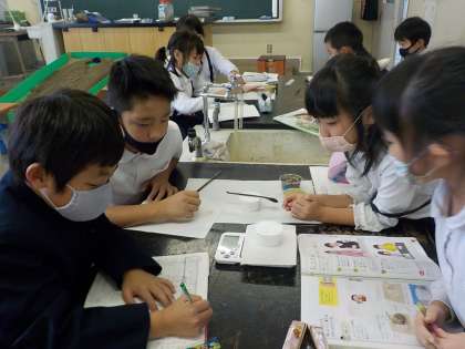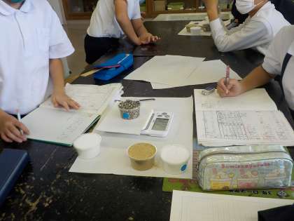 今日は、前の時間に話題になったカップですりきり1杯をはかり取り、材質による重さの違いについて調べました。塩、砂糖、砂、砂利を同じカップ一杯分の重さで比べる実験でした。一班4人なので、全員が「すりきり1杯」をはかり取る経験をすることができました。