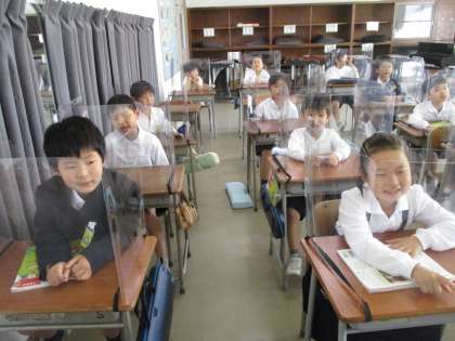 今日は、初めてマスクをはずして歌いました。ガードを取り付け、初めて歌った歌は、校歌です。これまで毎時間、音楽の時間の最初に校歌を聴いていたので、子供たちは歌詞を見ないで歌えるようになってきています。のびのび歌えるように、これからも練習していきます。