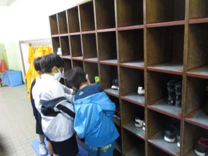 今朝、子供たちに「履いてきた靴の入れ方はどうかな。きちんとそろえた自信のある人」と聞くと、半数くらいの子が手を挙げました。そこで、下足箱へ行って確認し、きちんと入れ直しました。意識して行動することが、よい習慣につながります。またみんなで声を掛け合っていきたいです。