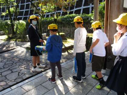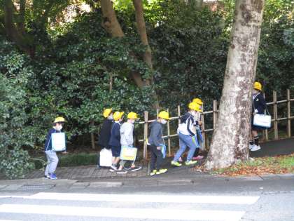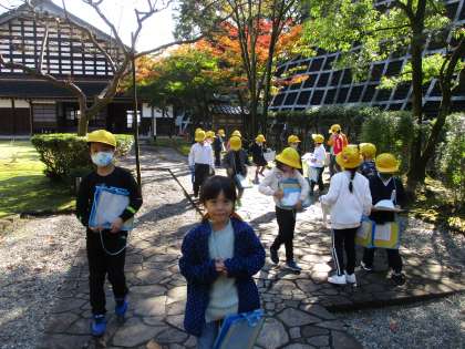「ここの砂利は踏んじゃだめだよ」「次は、あっちの建物に行くよ」と声掛けをする2年生。1年生もみんなの列に遅れまいと一生懸命に歩いていました。さまざまな秋を見付け、みんな満足そうでした。
